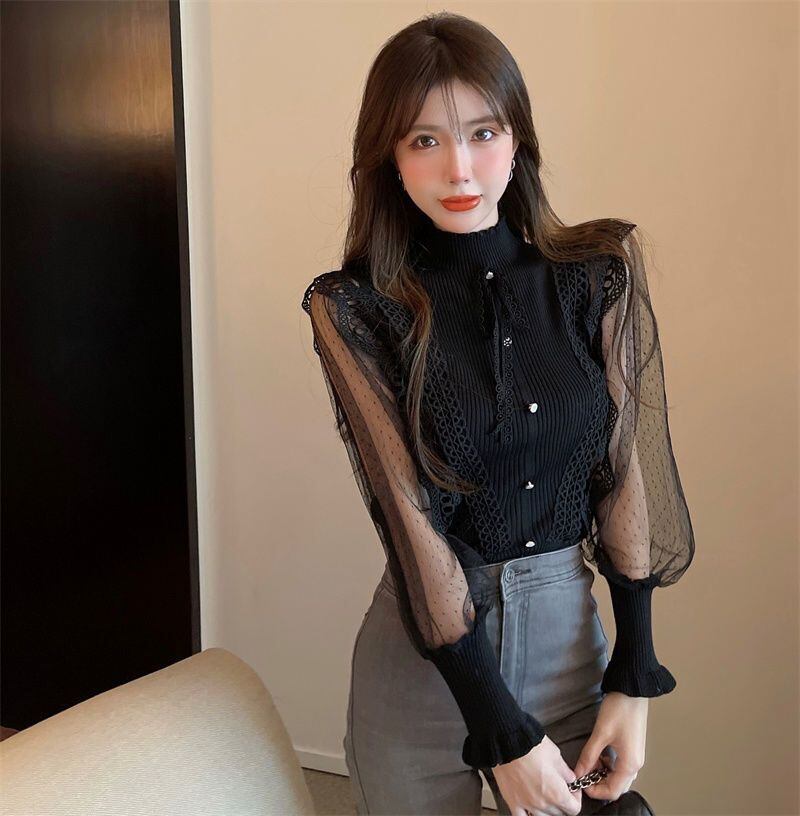 ボウタイ ハーフネック ドット柄 パフスリーブ ニットセーター