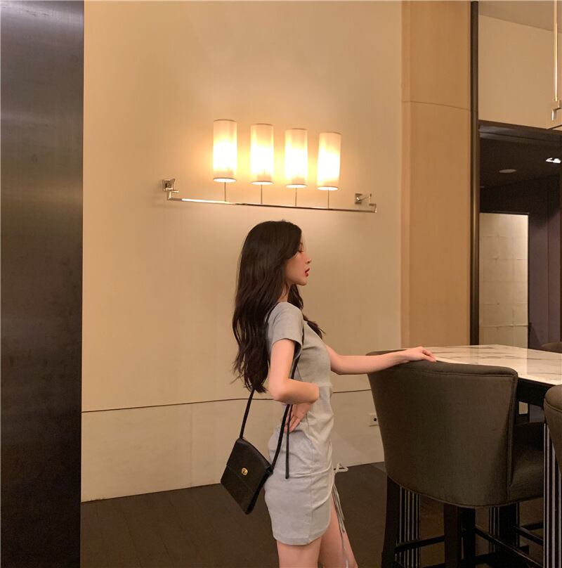 [韓国っぽワンピース]グレー 定番 無地 シンプル ギャザー飾り ボウタイ カジュアル
